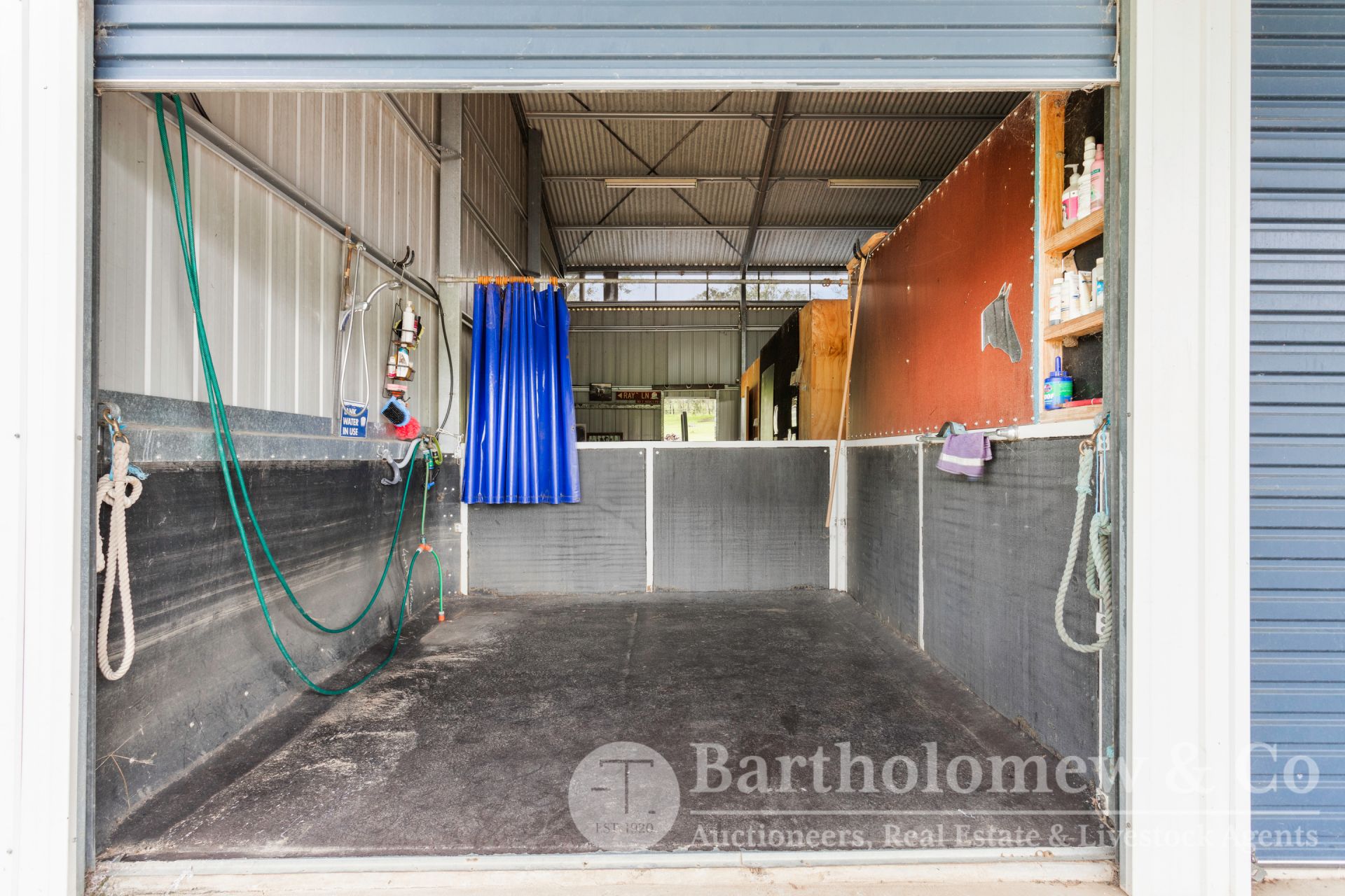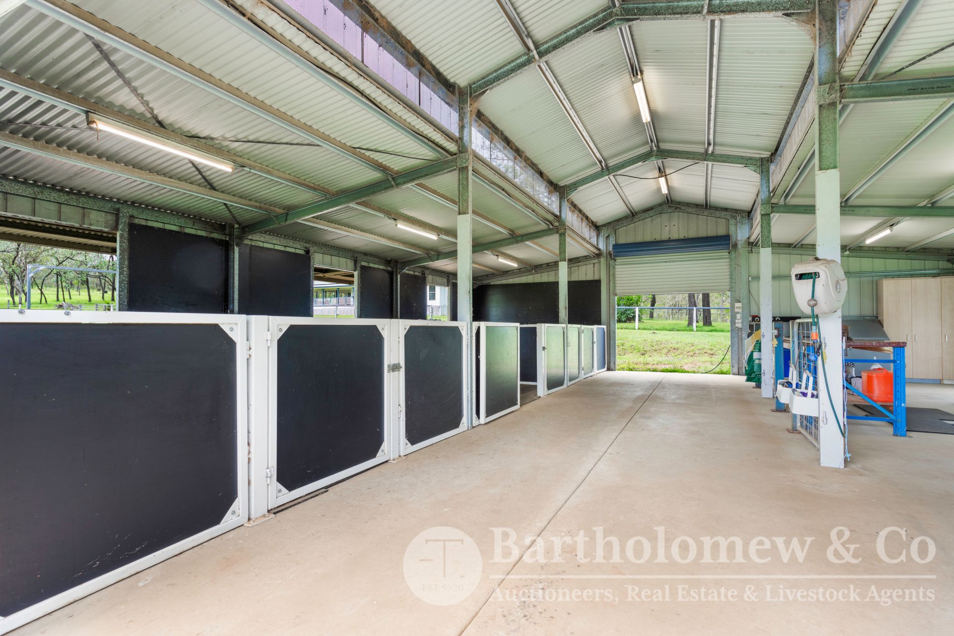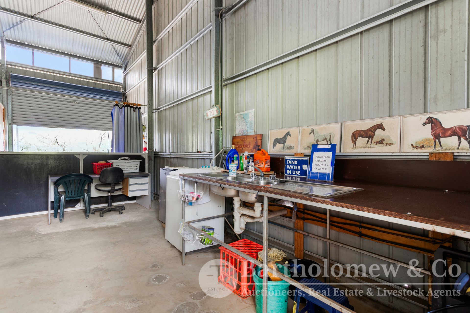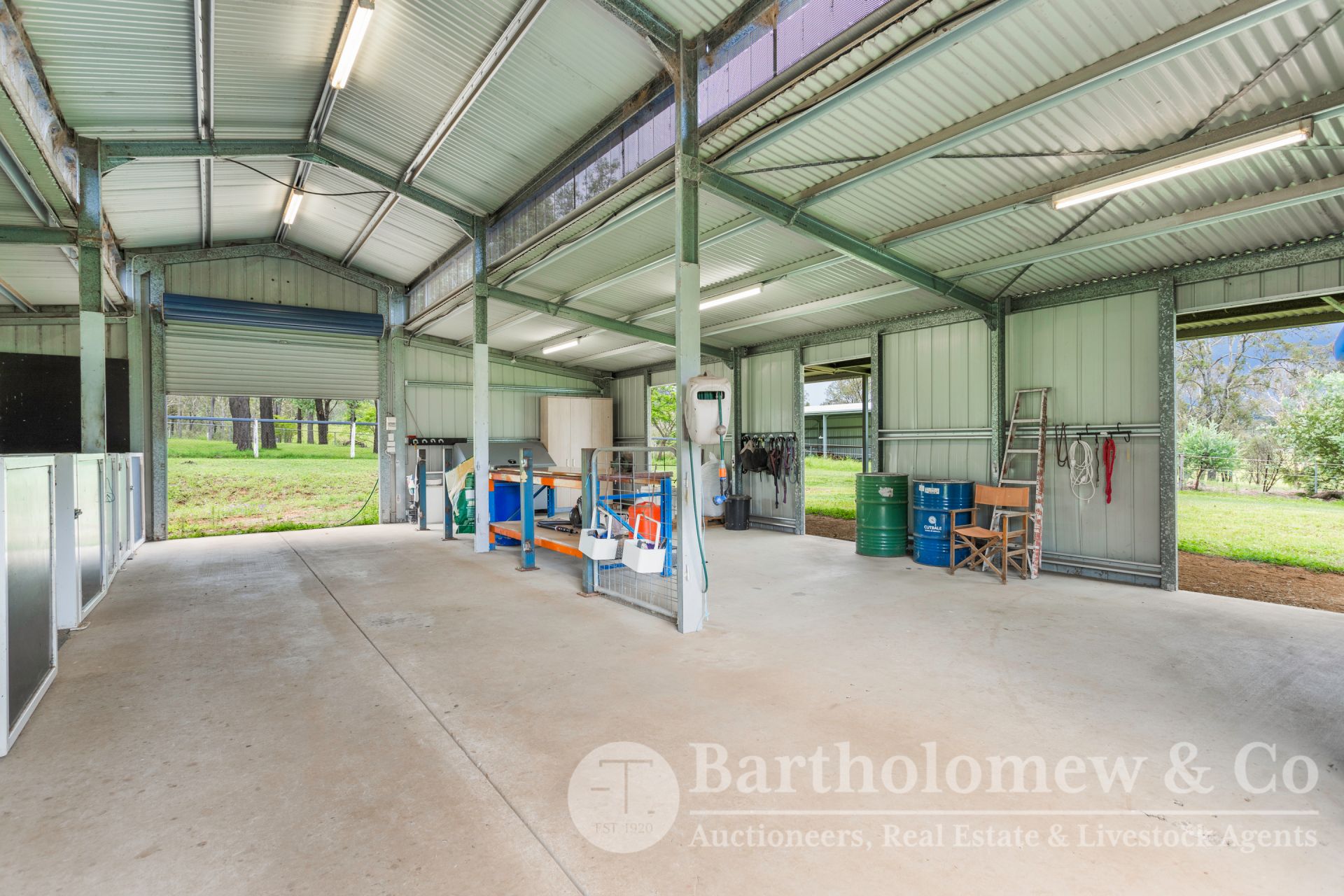The large shed is approx. 24m x 9m with 3m awnings either side, power & water connected, has lockable tack rooms, wash bay + hot & cold water, kitchenette, 6 portable yards under back awning with automatic waterers, 15 Amp power outlet socket. A second shed is approximately 12m x 12m + 3m awnings either side, internally there are 3 stables with waterers, concrete floor and power (15amp). The third shed is approx.12m x 6m which has power and water connected.