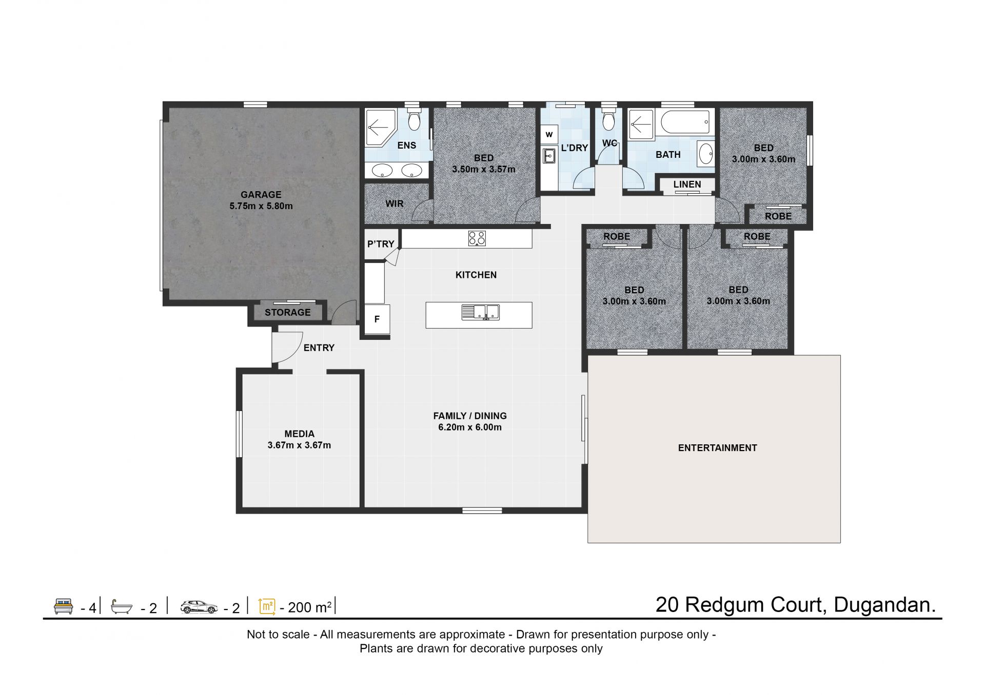 Look no further than 20 Redgum Ct, Dugandan! If you are after the modern home but don't want the wait or hassle of building then this will be for you. Located in a quiet cul-de-sac street and having a lovely rural backdrop this property will suit a range of Buyers. The home built by a local builder circa 2016 presents like new with fresh paint and new floor coverings! The home features higher than standard ceilings, 4 bedrooms, ensuite to main bedroom with double vanity, new fans throughout, new air-con to living area and main bedroom, huge kitchen with stone benchtops, dishwasher and new electric stove. A huge entertaining space flows from the living and is under the main roof line. The 800m2 block has a securely fenced rear yard, side vehicle access and established vege garden! With nothing to do but move in and enjoy make sure you book your inspection today!