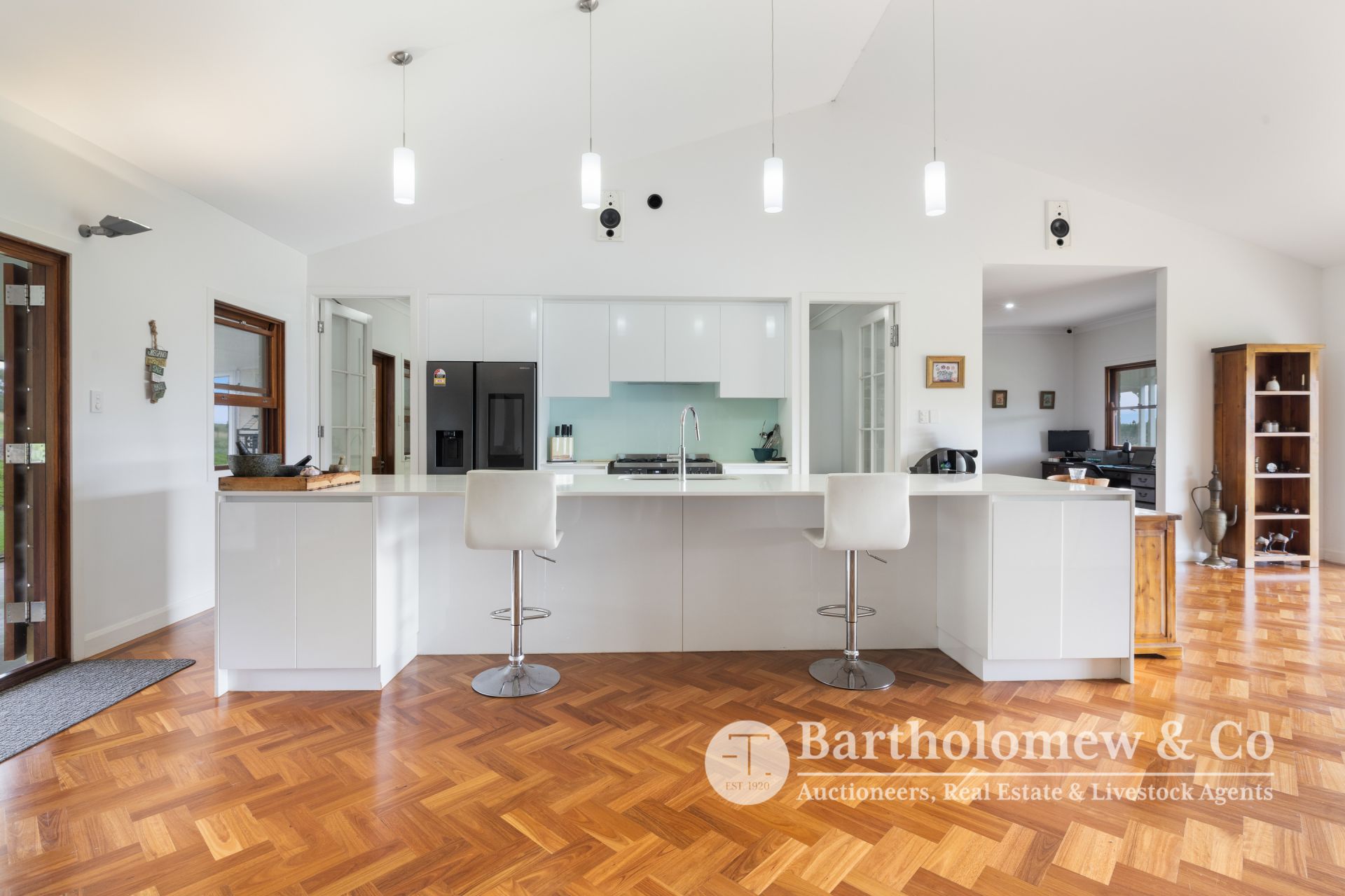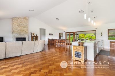 Attention to detail is evident in the high-end inclusions such as Grohe tapware, soft-close cabinetry, wall-hung toilets, and premium New Guinea Rosewood doors and double-hung windows. The warmth of 14mm Blackbutt parquetry flooring is complemented by stunning cathedral ceilings and a Jetmaster inbuilt wood-burning fireplace framed with stacked quartz.